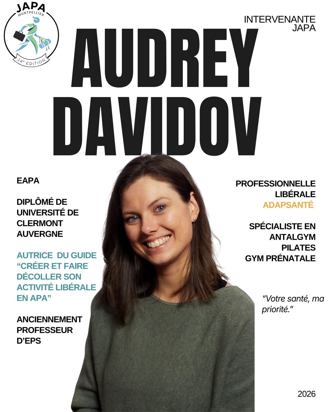 Engagée dans le développement de l’APA en libéral, elle accompagne également les professionnels souhaitant se lancer dans ce mode d’exercice à travers des formations et son ouvrage « Créer et faire décoller son activité libérale en Activité Physique Adaptée ».