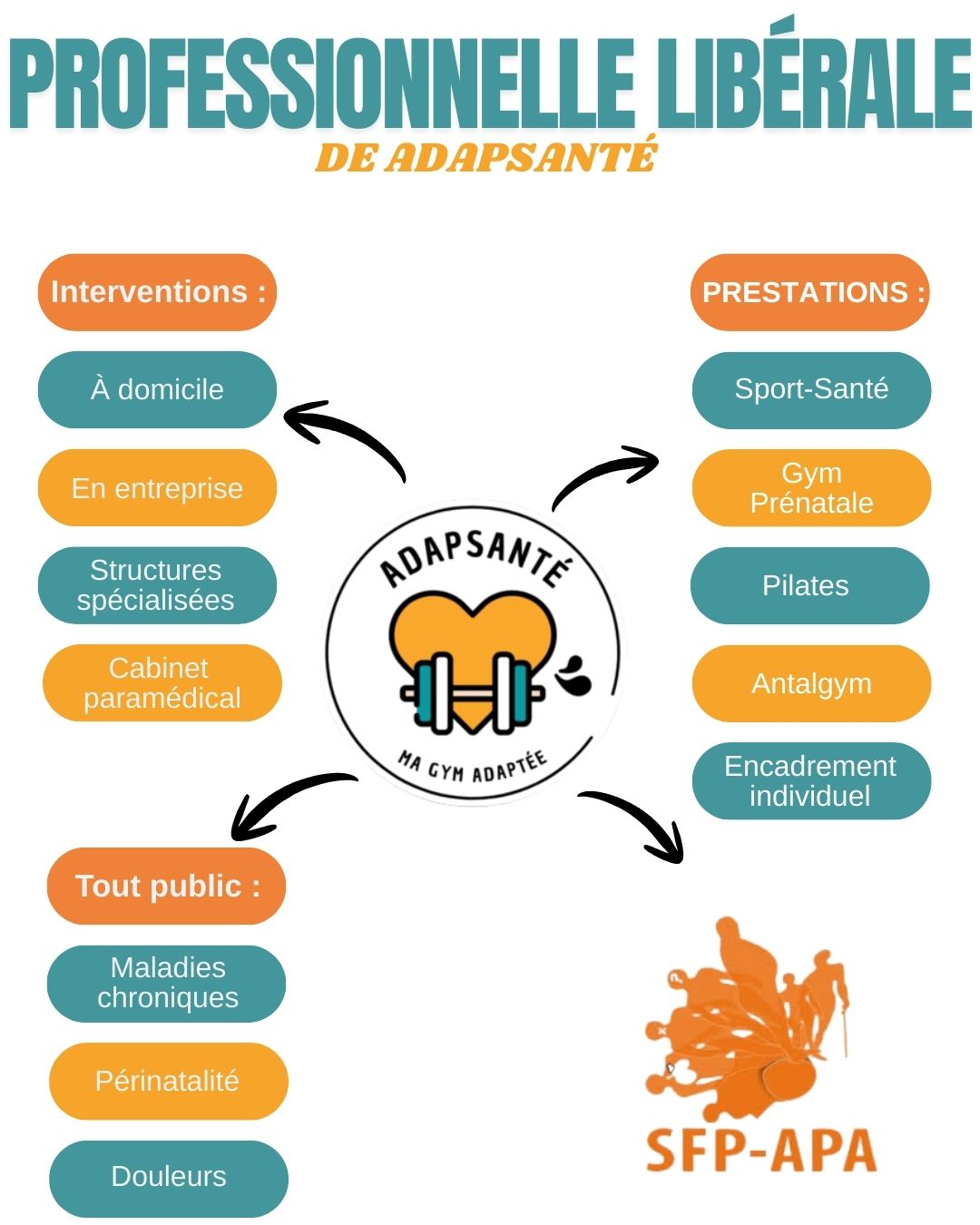 Enseignante en Activité Physique Adaptée exerçant en libéral au sein de son auto-entreprise ADAPSANTÉ, elle accompagne différents publics dans une démarche APA et santé, notamment autour des douleurs chroniques, de la périnatalité et de la reprise d’activité physique.