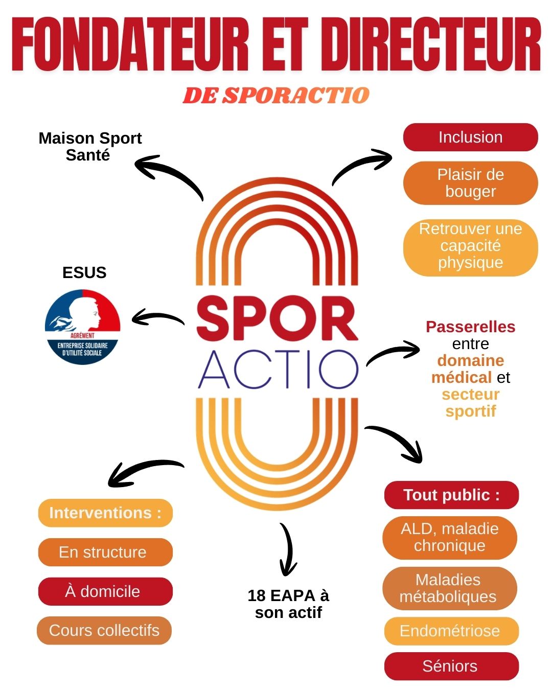 Enseignant en Activité Physique Adaptée (EAPA) et coordinateur en Maison Sport-Santé, il est le fondateur et directeur de SPORACTIO, une structure engagée dans le développement du sport-santé et l’accompagnement des publics présentant des pathologies chroniques ou des besoins spécifiques.